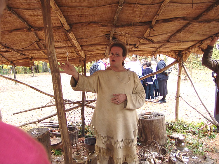 Costumed interpreter explains art and craft of making weapons and tools used by native Americans.